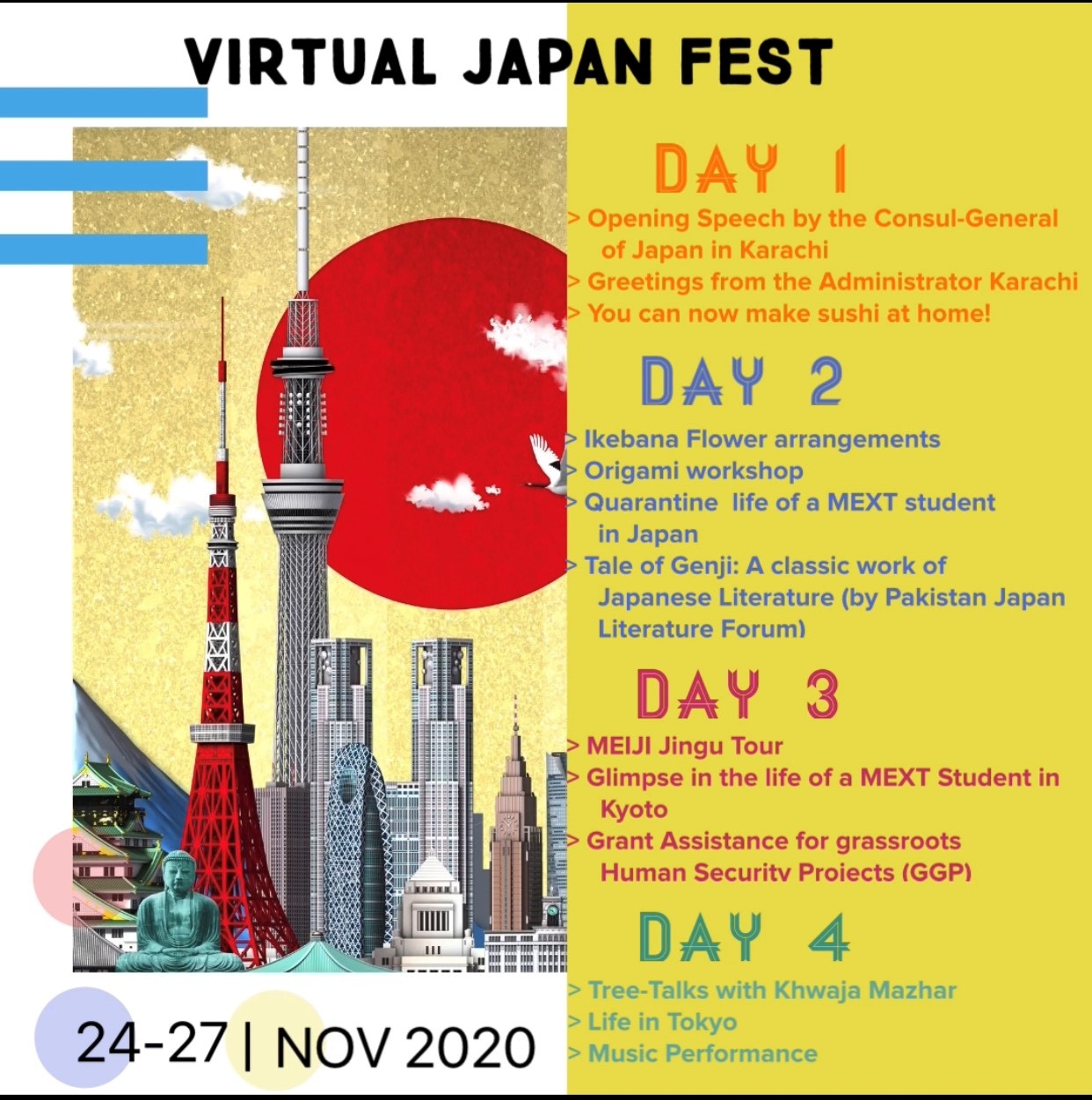 Every year, Consulate-General of Japan in Karachi organizes Japan Fest designed to promote understanding and friendship between Japan and Pakistan. However, due to COVID-19, this year’s event will be celebrated from our official Facebook page. The four day online event (24-27, Nov) will show daily videos related to Japanese culture, traditions and lifestyle. The videos will be uploaded at 13:00, 15:00 and 17:00 hours every day during the period. The program includes food demonstration, Ikebana, Bonsai and Origami workshop, Japanese literature review and some exciting musical performances by Japanese artists.